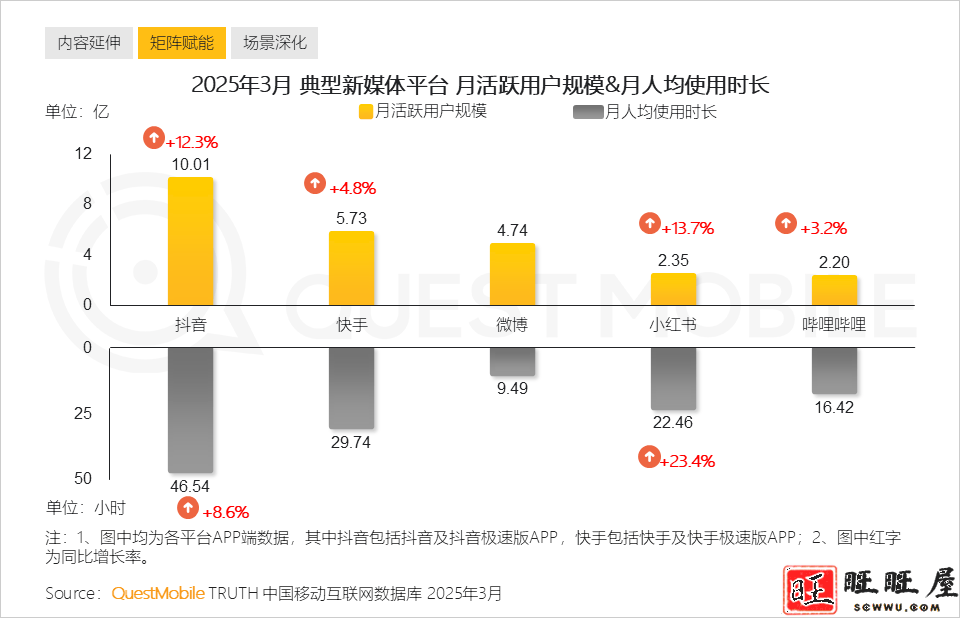 快手年报中也指出,2024年下半年,我们的平均日活跃用户数突破4亿大关。快手将这一节点称为“快手用户生态建设迈入一个全新阶段”。 不过和快手最大的竞争对手抖音比较,这一月活数据仍和抖音存在较大差距。 QuestMobile发布的《2025年全景生态流量春季报告》显示,截至2025年3月,抖音(包括抖音和抖音极速版)月活跃用户规模突破10亿,达到10.01亿,同比增长12.3%。抖音月人均使用时长也增长至46.54小时,也就是说,平均每人每天刷1.5小时以上。 报告还显示,快手月活用户规模达5.73亿,同比增长4.8%,月人均使用时长为29.74小时。