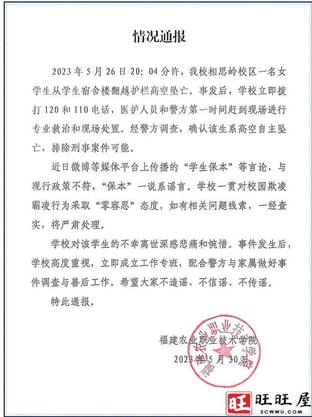 关于当事女生坠亡的相关情况校方和警方