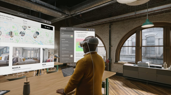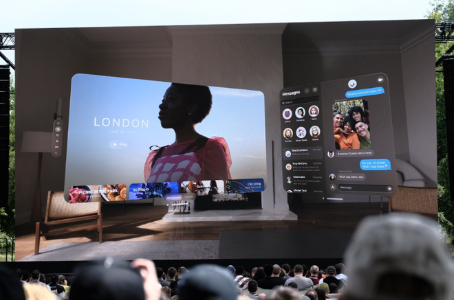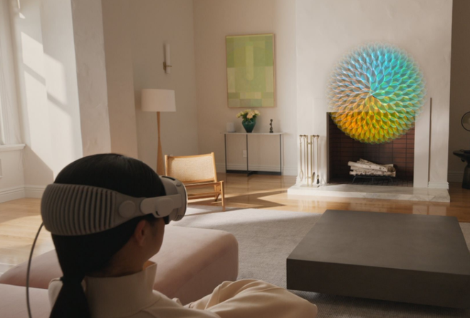 该设备使用透视视频让用户可以看到全彩色的真实世界,用户也可以将 3D 物体投影到真实空间中,包括从消息线程中把物体拉出来放到真实世界中。Vision Pro 上的 FaceTime 可以在视频通话时显示真人大小的人物,还优化了查看照片和视频的体验。Vision Pro 也是“苹果的第一款 3D 相机”,可以通过空间音频在视频中显示深度。该头显具有影院级视频观看体验,可将屏幕缩放至超出房间的尺寸。