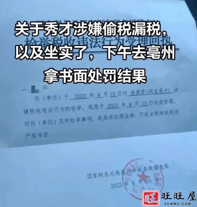 首页新闻 正文 9月2日,千万网红主播“秀才”账号被封禁引发热议。据相关媒体报道:抖音相关负责人表示,该账号违反平台相关规定,已封禁。据知情人士透露,秀才近期被举报存在违法行为,这可能是他被封禁的部分原因。8月31日,据媒体报道,一份《检举税收违法行为受理回执》显示,2023年8月15日,有人实名向国家税务总局毫州市税务局稽查局,检举了徐xx(网名秀才)涉嫌税收违法行为,已于当天被受理。 版权声明:未经旺旺屋授权转载请注明来源,否则侵权必究